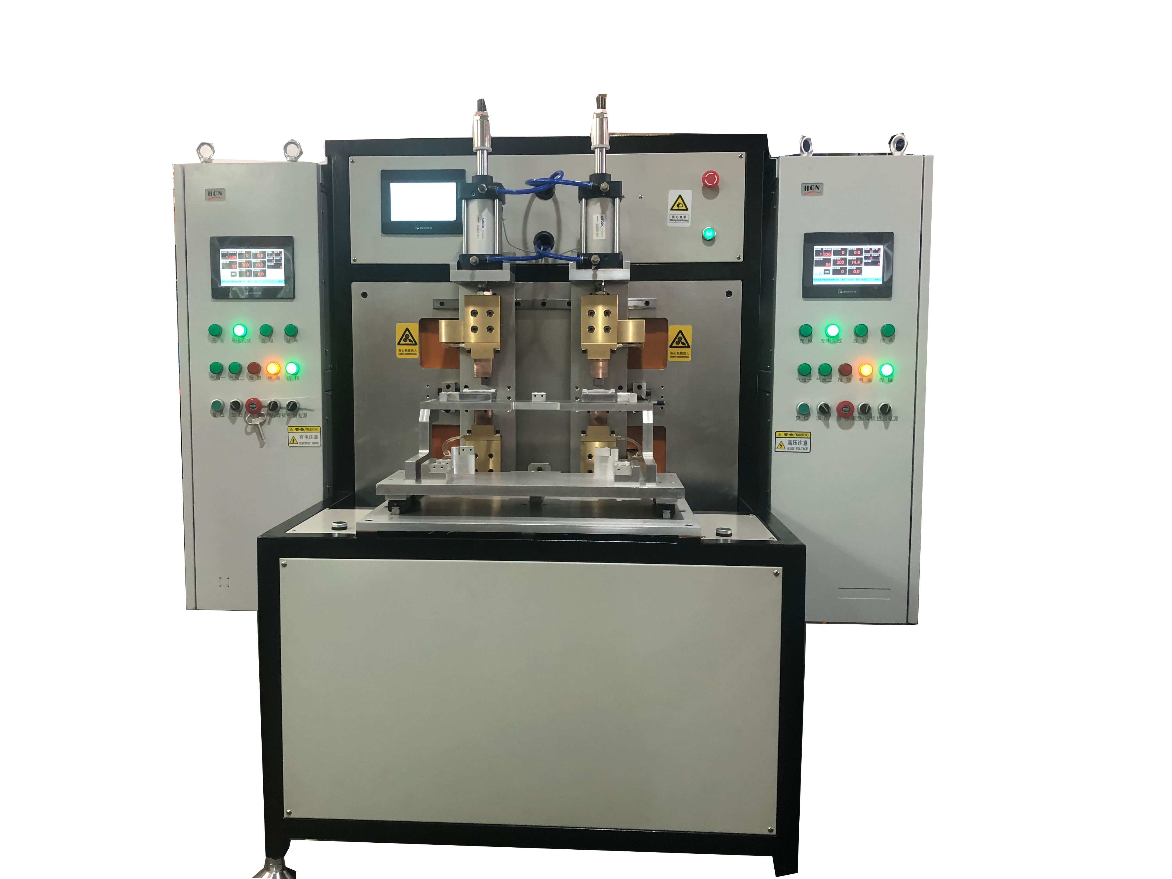 點焊機系采用雙面雙點過流焊接的原理,作業時兩個電極加壓工件使兩層金屬在兩電極的壓力下構成必定的觸摸電阻,而焊接電流從一電極流經另一電極時在兩觸摸電阻點構成瞬間的熱熔接,且焊接電流瞬間從另一電極沿兩工件流至此電極構成回路,并且不會傷及被焊工件的內部結構。